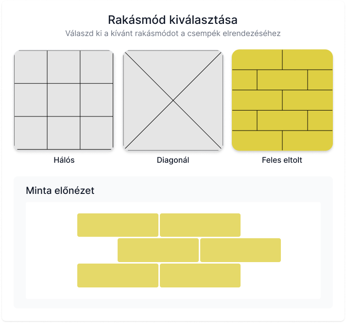 Igen. Az anyagkalkuláció tartalmazza a szabványos vágási veszteséget (pl. 10–15%), valamint lehetőség van a saját munkamódszerhez igazítani a plusz anyag kalkulációját (pl. sarkok, fugázás, hibás lapok pótlása).