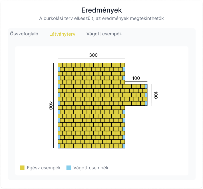 Igen. A vizuális kiosztási terven pontosan megjelennek a vágott lapok helyei és méretei, így a burkoló előre tervezheti a vágásokat és optimalizálhatja a munkaidejét.